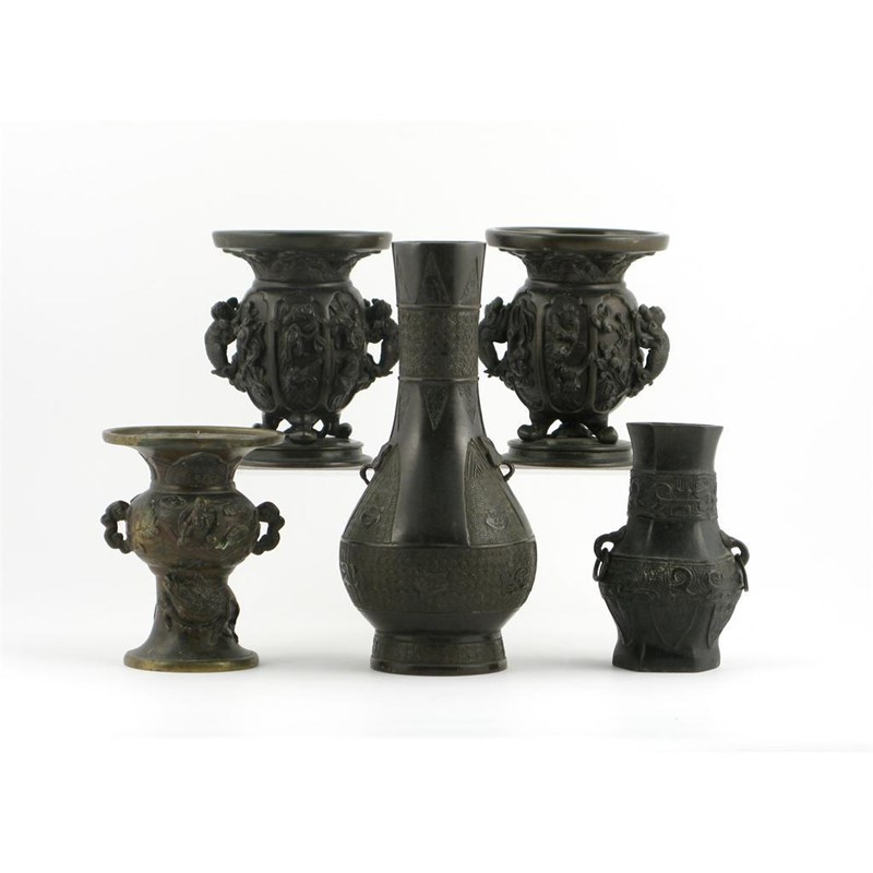 Five bronze vases, including a pair cast in high relief with birds, flowers and foliage, 19th century, 23cm max. (5)