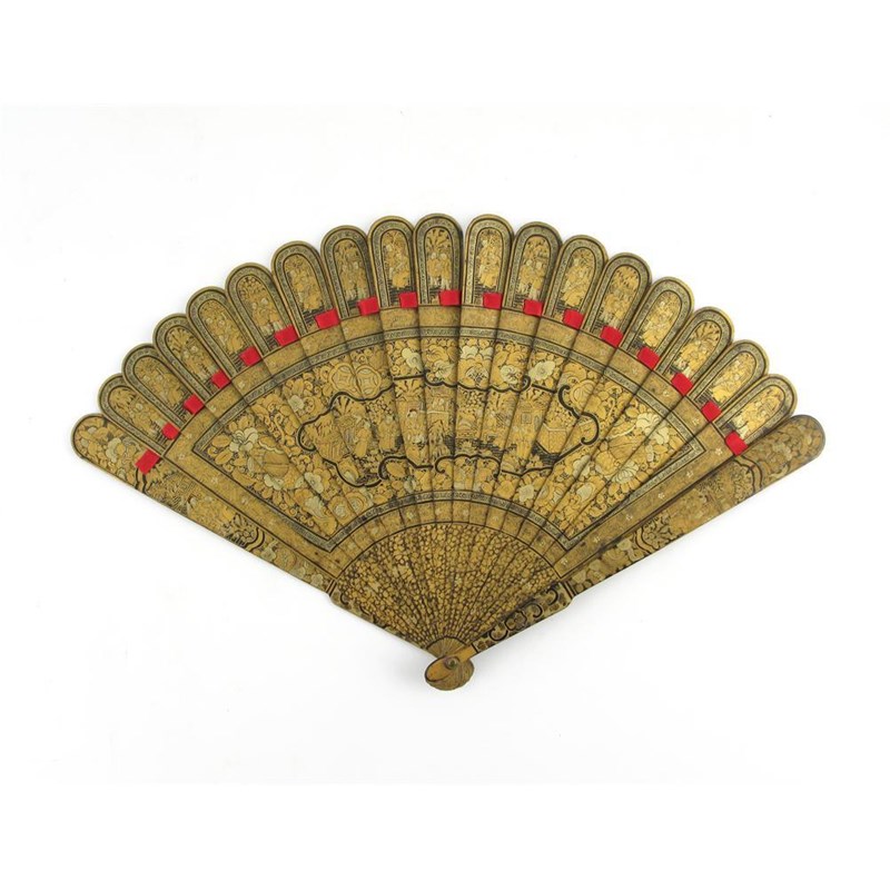A Chinese lacquer fan, decorated in gilt with shaped panels containing a multitude of figures, all on a complex floral ground, c.1900, a little wear, 32.5cm.