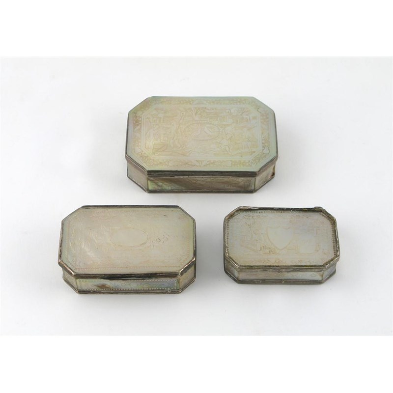 Three Chinese mother of pearl silver mounted rectangular boxes, with hinged lids and engraved with figures and shields, the sides with flowers and landscape scenes, all 19th century, minor damages and repairs, 7.8cm. (3)