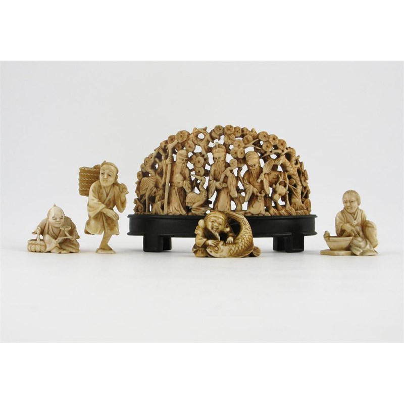 Four small Japanese ivory carvings of figures, one with a flower, one with a fish, another carrying a basket and a seated lady stirring a pot and an ivory plaque depicting three figures with two cranes and a deer all in a pine grove, the four figures signed, 19th century, the plaque damaged with a wood stand, 11cm. (6)