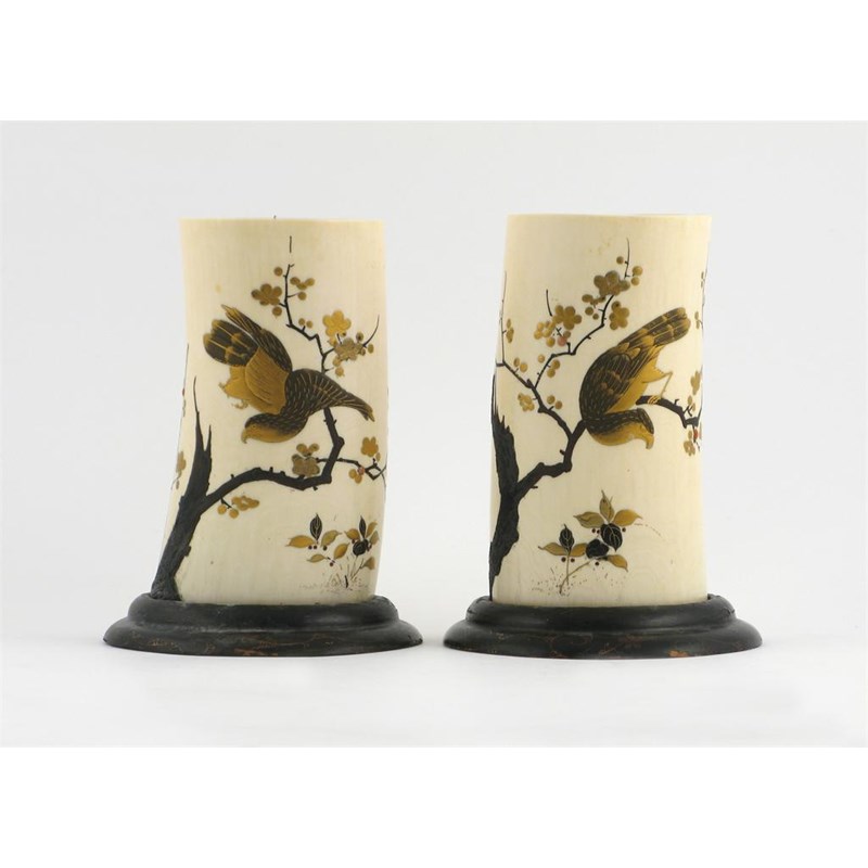 A pair of Japanese ivory tusk vases, decorated in gold lacquer with birds perched on flowering prunus, with smaller birds, bamboo and flowers, Meiji 1868-1912, some damages and restoration, 14cm. (2)