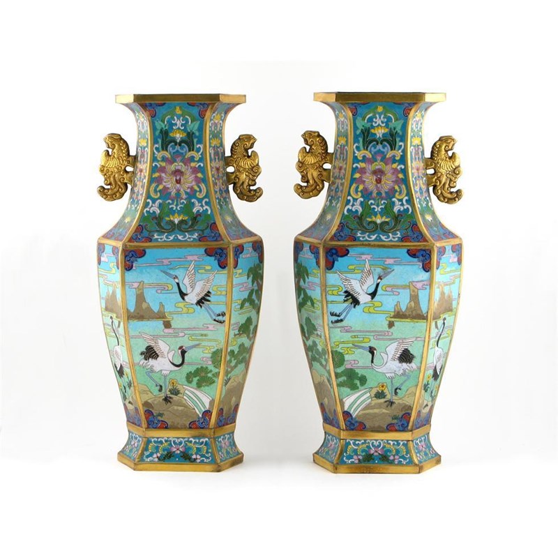 A large pair of Chinese cloisonné hexagonal section vases, decorated with cranes, standing and flying in rocky mountainous landscapes with pine, the necks with large lotus panels, each with a four character Xuande mark to the base but 19th or 20th century, 45.4cm. (2)