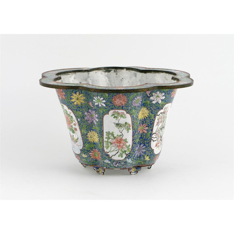 A Chinese Canton enamel hexagonal jardinière, the lobed body painted with panels containing birds and flowers on a blue ground, richly decorated with leaf scrolls and flowerheads, the base with a four character Qianlong mark, 18th or 19th century, damages, 22.3cm.