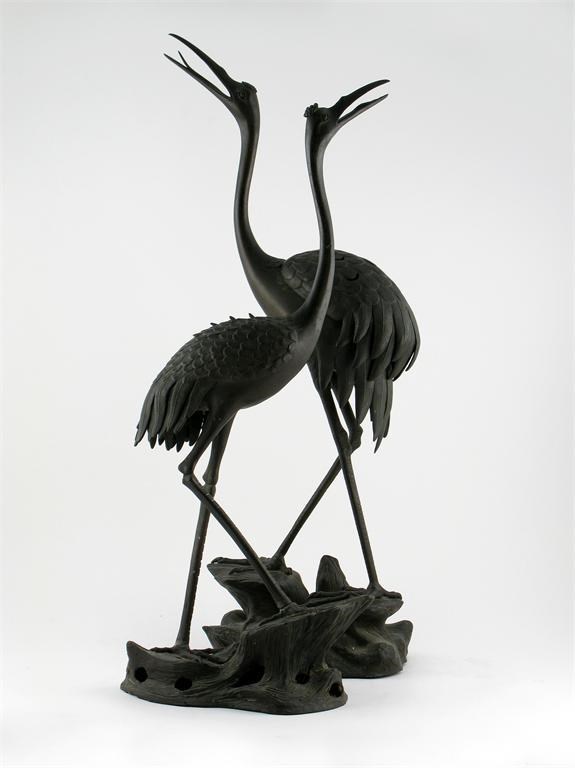 A pair of Japanese bronze incense burners and covers, formed as cranes, standing on rocks, c.1900, 70cm. (4)