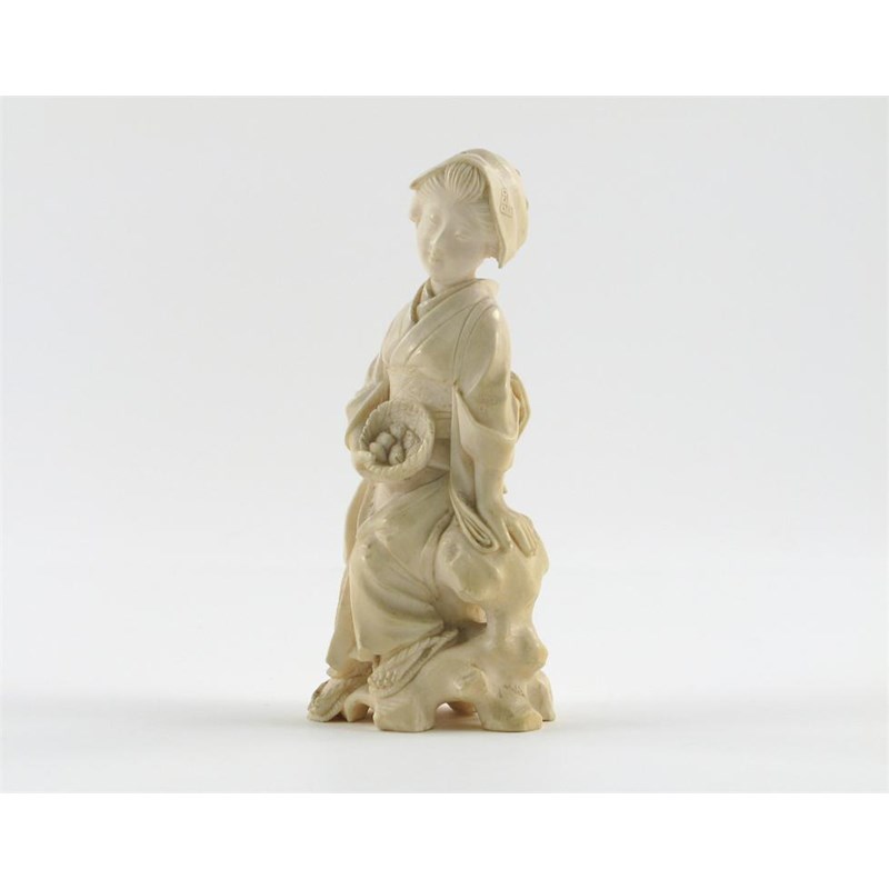 A Japanese ivory carving, of a girl sitting on a rock, holding a basket of fish, c.1900, 12cm.