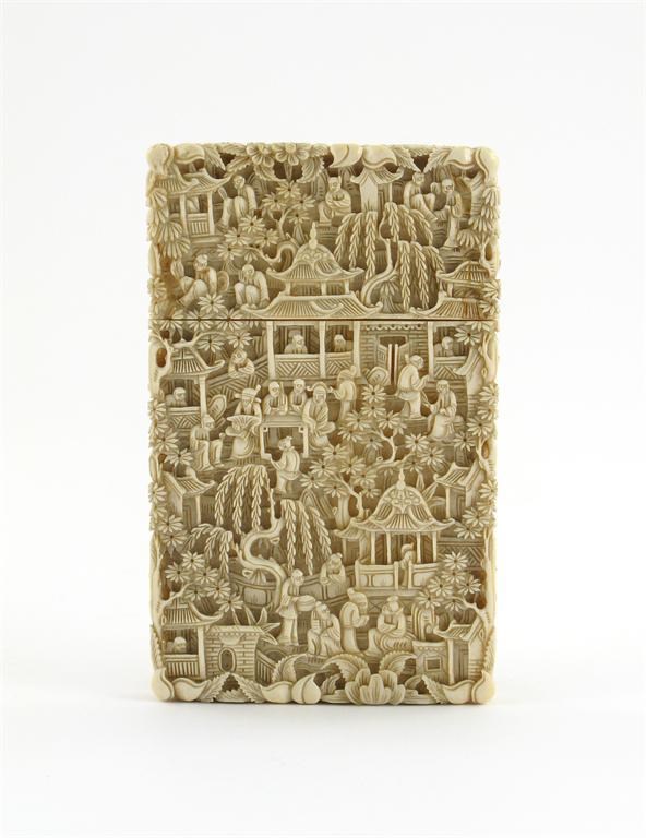 A Chinese Canton carved ivory cardcase, decorated with many figures amidst pagodas and trees, 19th century, 10.5cm. (2)