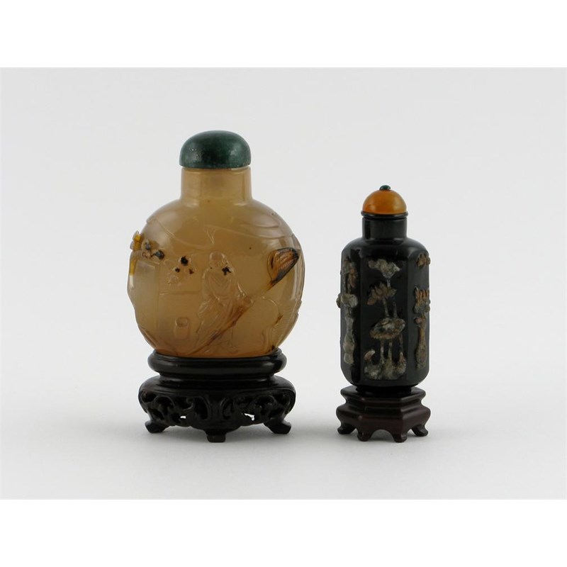Two Chinese snuff bottles, one chalcedony carved with a man holding a butterfly net and two figures beneath a tree, the other black quartz of hexagonal section, both 19th century, 6.5cm. Both on wood stands. (4)