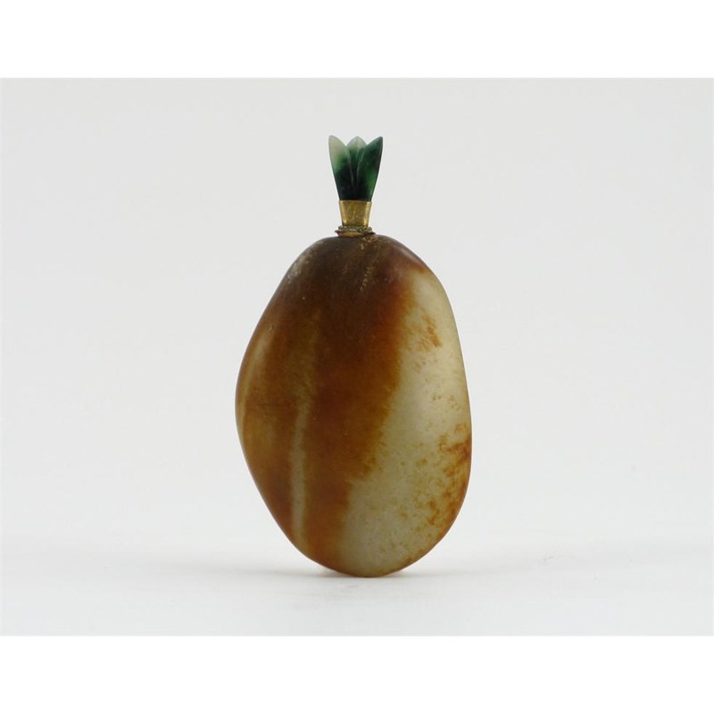 A Chinese snuff bottle, carved from a russet streaked celadon jade pebble, the stopper jadeite, 19th century, 9cm.