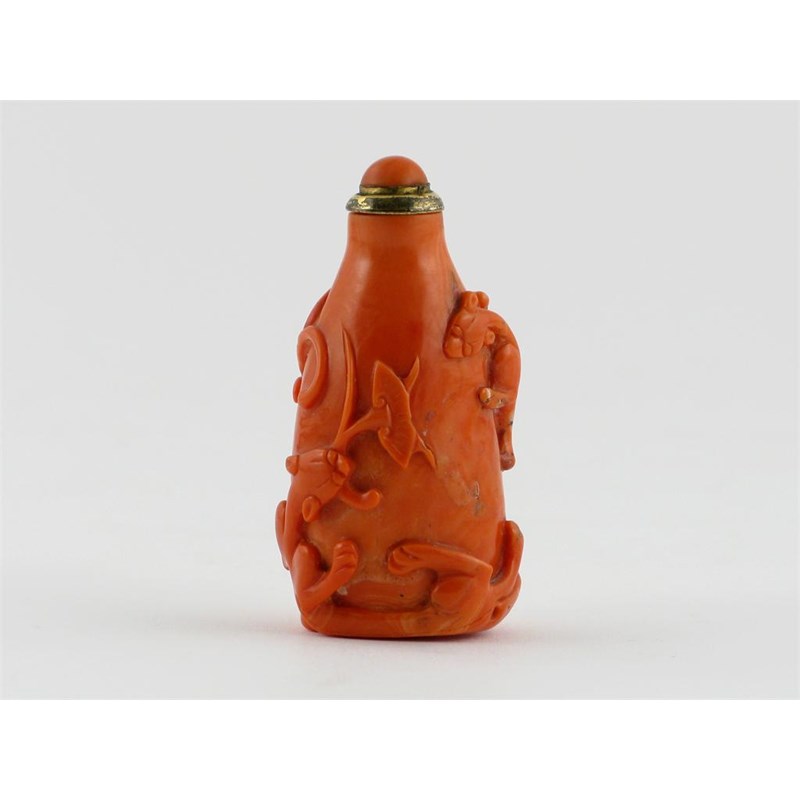 A Chinese coral snuff bottle, carved in relief with two chilong dragons, the tail of one forming the foot, 18th century, 6.4cm.