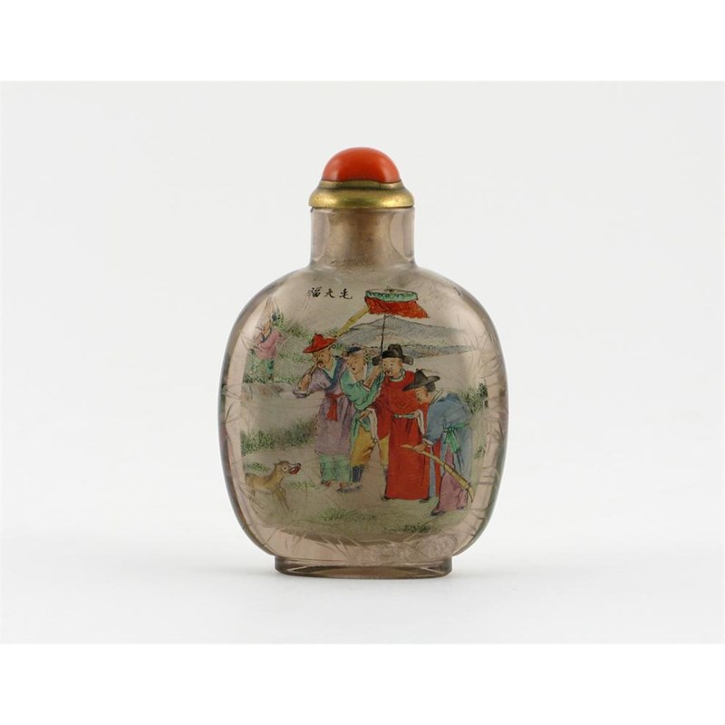 A Chinese interior painted snuff bottle, decorated with figures in a garden and in a landscape, by Yeh Zhongsan, dated 1922, 8cm.