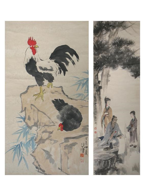 Six Chinese scroll paintings, one depicting a cockerel and hen, three of young ladies, two seated, one of Chairman Mao with children at the waters edge and another of figures beneath a pine tree, 20th century, 141cm max. (6)