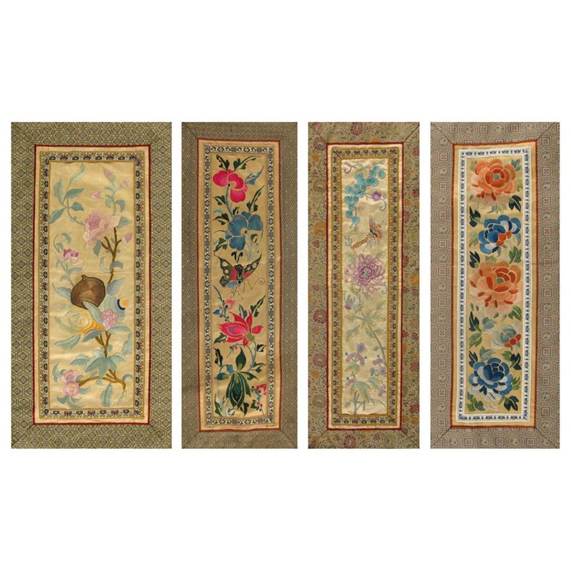 Six Chinese embroidered panels, decorated with butterflies, flowers, birds and fruiting branches, 19th century. (6)