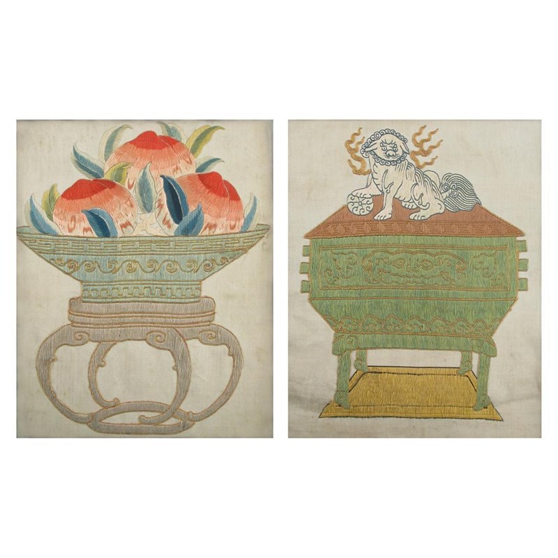 Three Chinese embroideries on silk, two depicting bowls containing peaches and pears, the third of a censer with a liondog finial, 19th / 20th century, 27cm. (3)