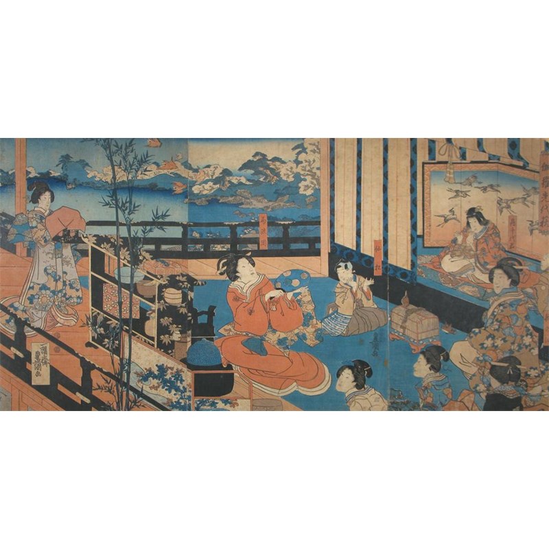 A Japanese triptych, depicting female figures and children on a verandah, signed Toyokuni, 19th century, framed and glazed, 35cm x 70cm.