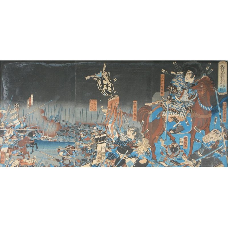 Two Japanese wood block triptychs, both depiction Samurai battle scenes, one signed Kunitsuna, both 19th century, both framed and glazed, 75cm. (2)