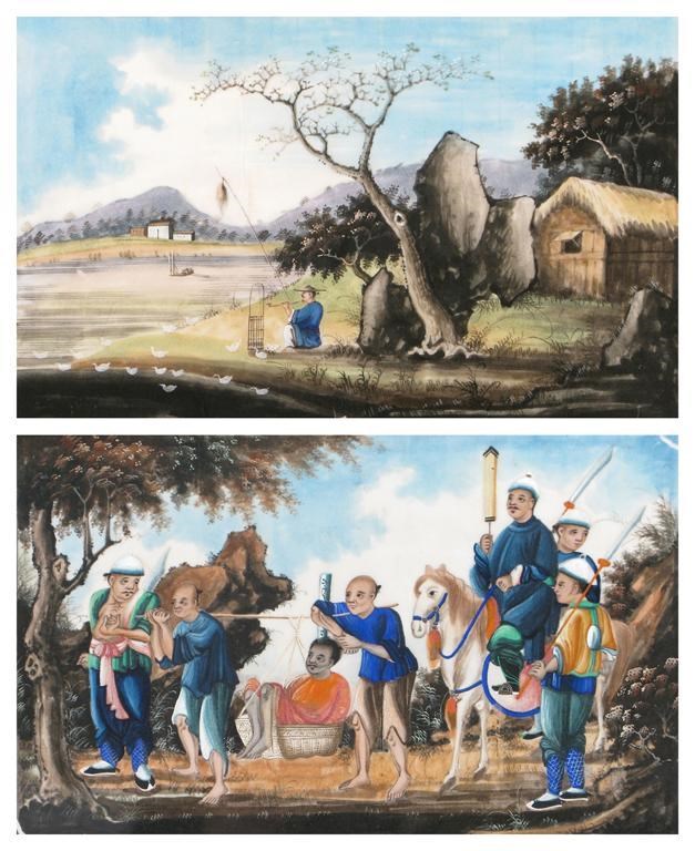 Four Chinese rice paper paintings, variously depicting fruit, flowers, figures and a shipping scene, framed and glazed, some damages, 31cm. (4)
