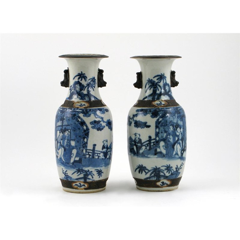 A pair of Chinese blue and white crackleware vases, with lion dog handles, the bodies painted with figures seated in a landscape, the necks, shoulders and feet with incised, unglazed bands, four character Chenghua marks but c.1900, 36.5cm. (2)