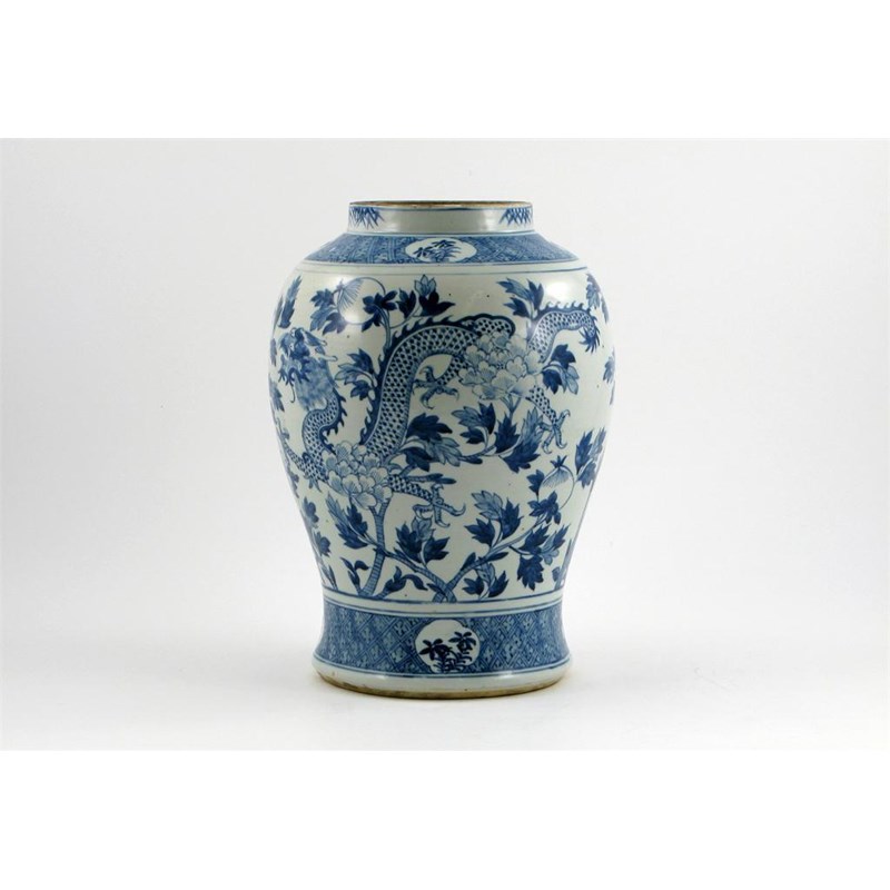 A Chinese blue and white ovoid vase, painted with two dragons amidst chrysanthemum, 19th century, some restoration to the neck, 35.5cm.