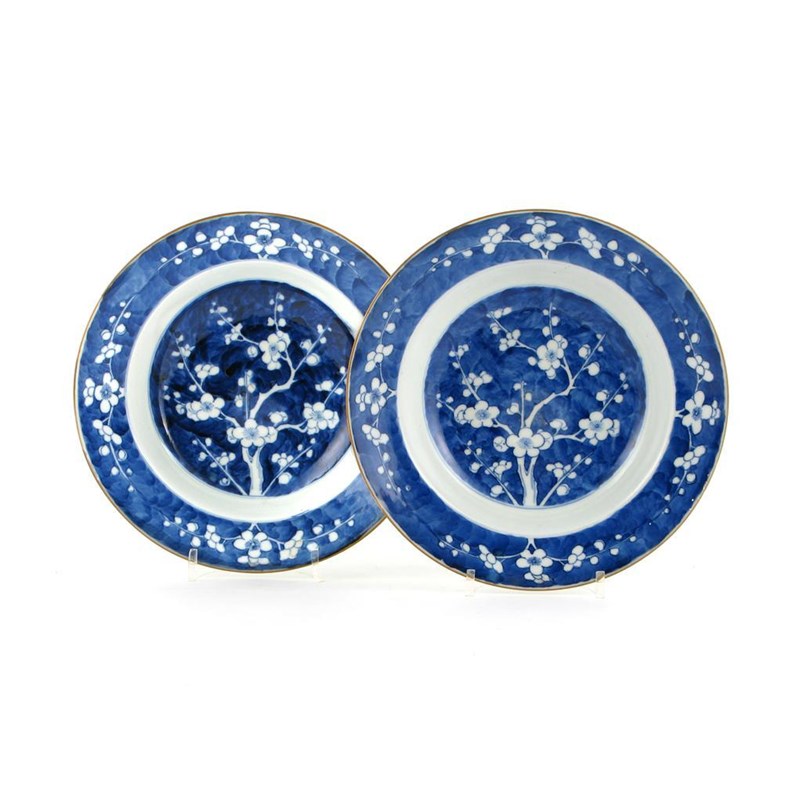 A pair of Chinese blue and white prunus decorated soup plates
