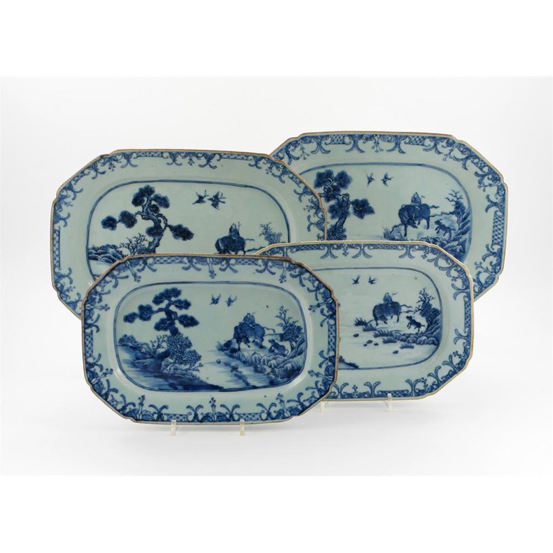 Four Chinese blue and white dishes, each painted with a boy riding a water buffalo on the banks of a river, all 18th century, one small dish chipped, 30.5cm. (4)