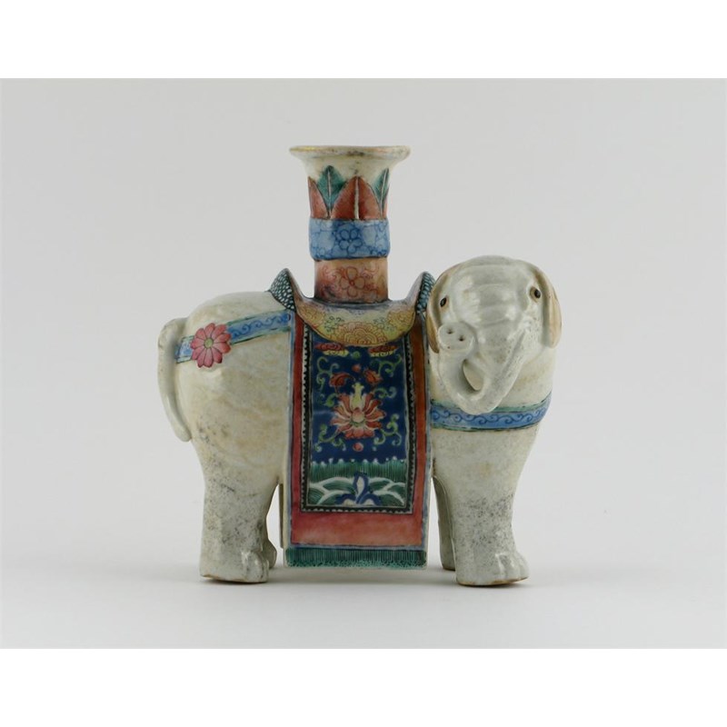A Chinese famille rose model of a caprisoned elephant, with a vase rising from his back, 19th century, small chips and a peppered glaze, 16.5cm.