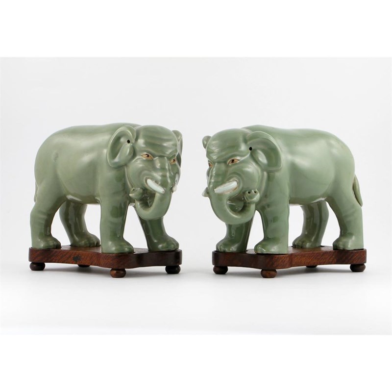 A pair of Chinese celadon models of elephants, the pachyderms standing four square and raised on wood stands, 25cm. (4)