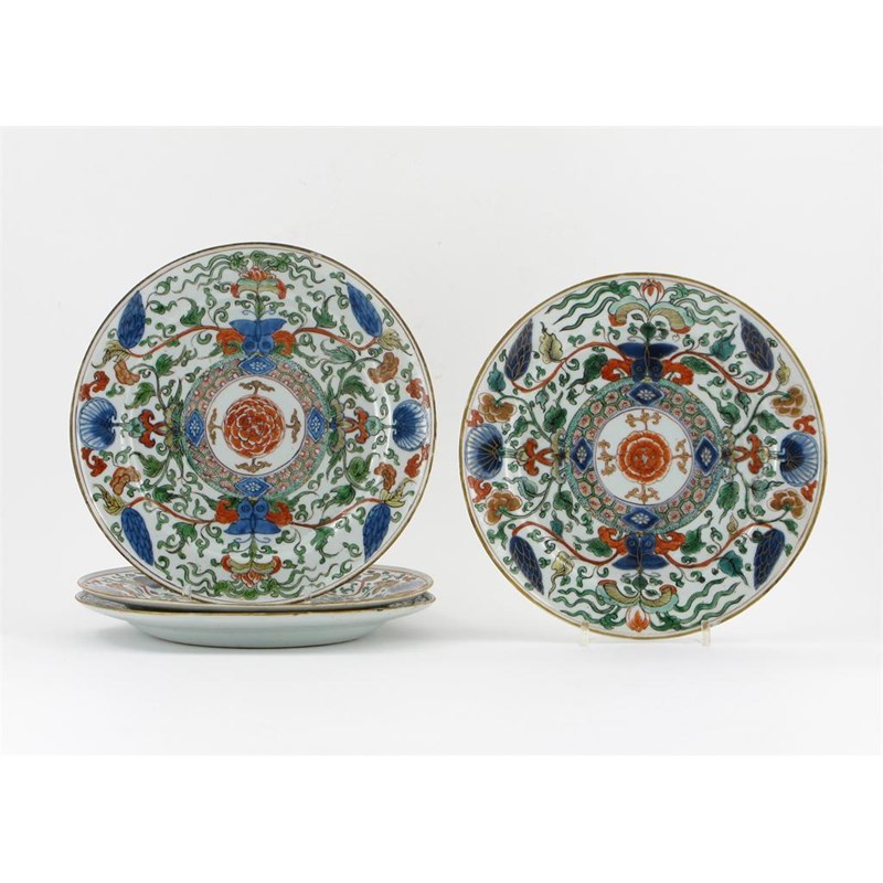 A set of four Chinese famille verte plates, decorated with butterflies, flowers and foliage, Kangxi 1662-1722, tiny rim chips, 23cm. (4)