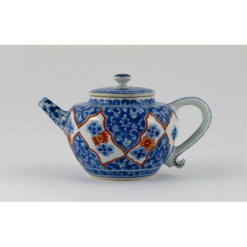 A rare Chinese blue and white teapot and cover, painted with red bordered panels containing flowers and surrounded by foliate motifs, first half 18th century, some gilt rubbing and minute chips to the spout, 8.5cm. (2)