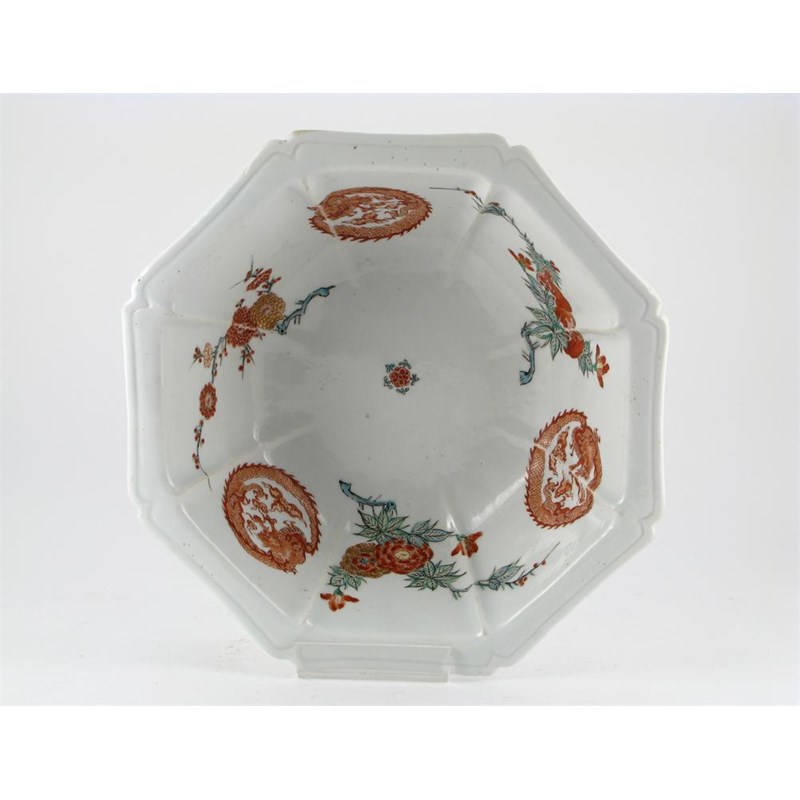 A porcelain octagonal bowl, decorated in the Kakiemon palette with circular dragons and blossoming branches, with a foliate rim, 19th century, 23.3cm.