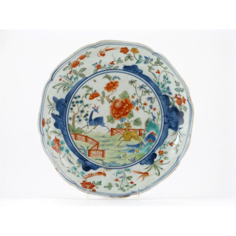 A Japanese dish, painted in the Kakiemon palette with two prancing deer, surrounded by a border of birds, flowers and rockwork, with a foliate rim, a Chenghua four character mark to the back, early 18th century, some restoration, 20.5cm.