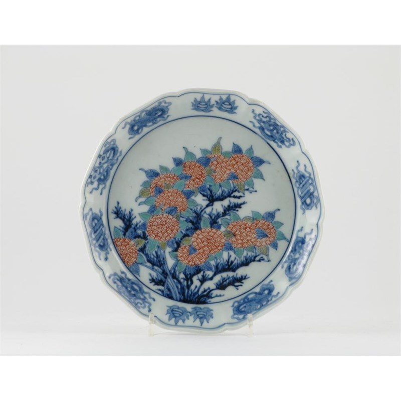 A Japanese moulded dish, painted in the Nabashema style with iron red hydrangeas, the border with auspicious symbols and with a foliate rim, 18th century, a rim crack and chip, 16.9cm.