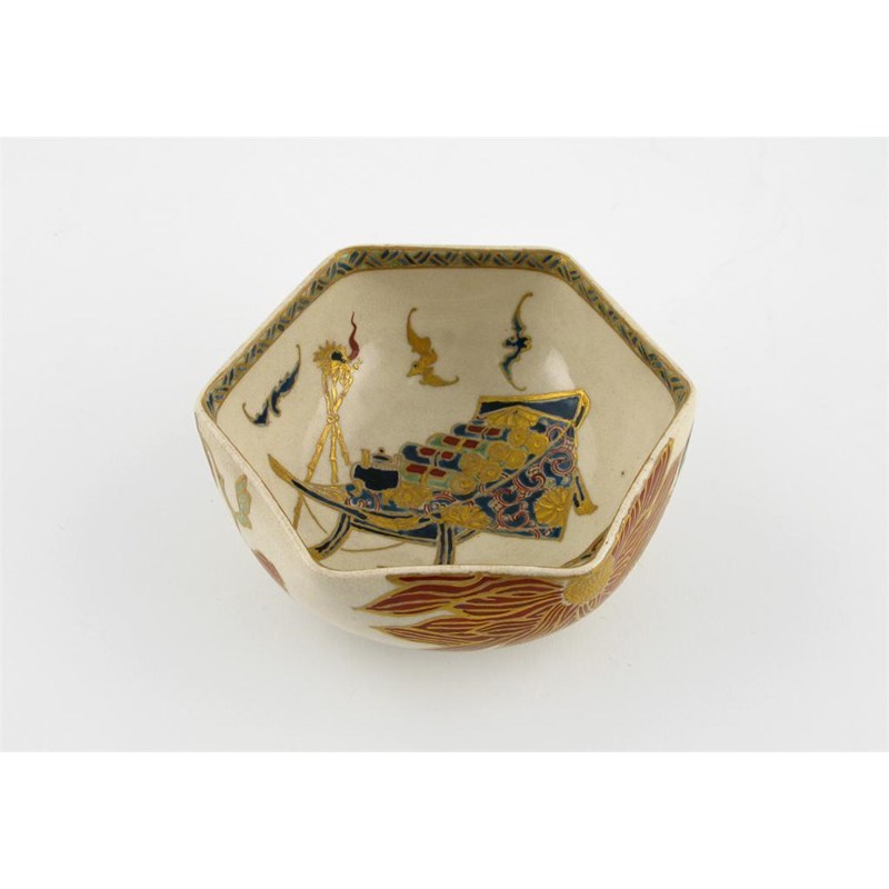 A Japanese Satsuma hexagonal bowl, decorated with bats flying above a table laden with scrolls and a koro, the exterior with flowers and leaves, the base with a three character mark, Meiji 1868-1912, 10.8cm.