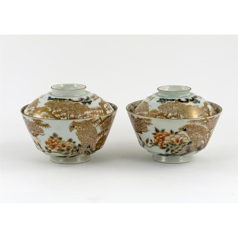 A pair of Japanese Imari bowls and covers, decorated predominately in gold with raptors perched on rocks amidst peony, pine and bamboo, 18th century, some restoration, 11.8cm. (4)