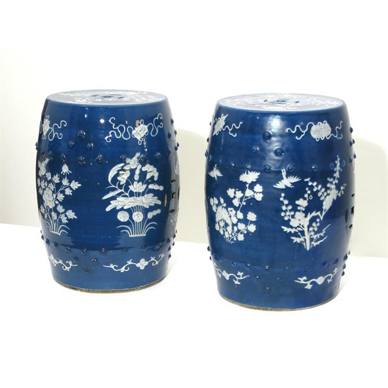 A pair of Chinese barrel-shaped garden seats, decorated with sprays of flowers, birds and auspicious symbols, in white slip on a blue ground, 19th century, one with restoration, 45cm. (2)