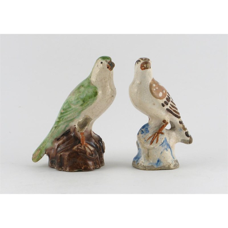 Two Chinese pottery models of birds, perched on rocks, one with green plumage the other brown, wear and glaze flaking, 10.2cm. (2)