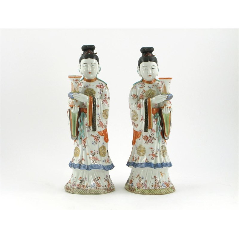 A pair of Chinese famille rose models of maidens, each standing and holding a gu-shaped vase, 20th century, minor faults, 38.5cm. (2)