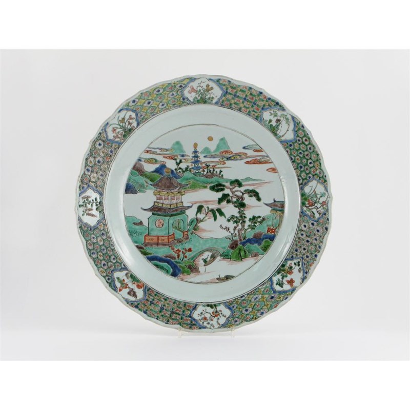 A large Chinese famille verte plate, brightly painted with a small figure in a boat in an extensive watery landscape with three pagodas, a pine tree and the setting sun, the border with eight panels containing differing flowering bushes on a complex diaper band, the reverse with an artemesia leaf mark, Kangxi 1662-1722, the centre with a restored drill hole, 38.5cm.