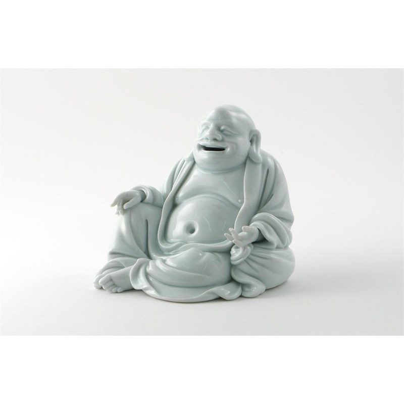A Chinese blanc de Chine seated model of Budhai Ho Shang, with his sack by his side, the reverse impressed with the seal mark of the Lin family, 18th / 19th century, restoration to his fingertips, 14.6cm.