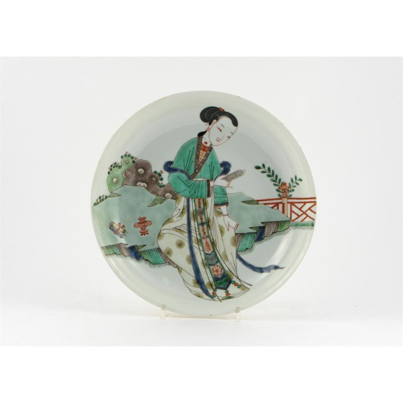 A Chinese famille verte saucer dish, painted with a maiden in a garden, 19th century, 23.4cm.