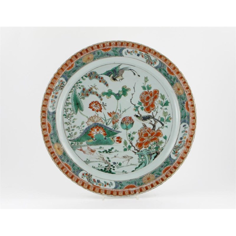 A large Chinese famille verte dish, painted with two birds amidst peony and lotus, above a pond with an egret, carp and large crustacean, Kangxi 1662-1722, a filled rim chip and glaze wear to the rim, 35.5cm.