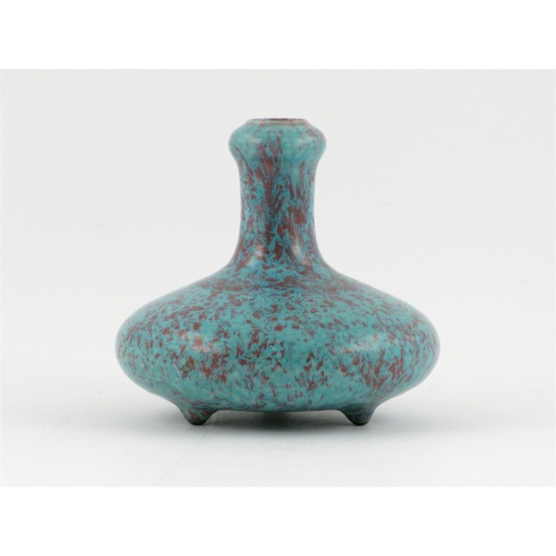 A Chinese robin's egg glazed small vase, raised on three stump feet, the base with an impressed four character Yongzheng mark but later, 11.5cm.
