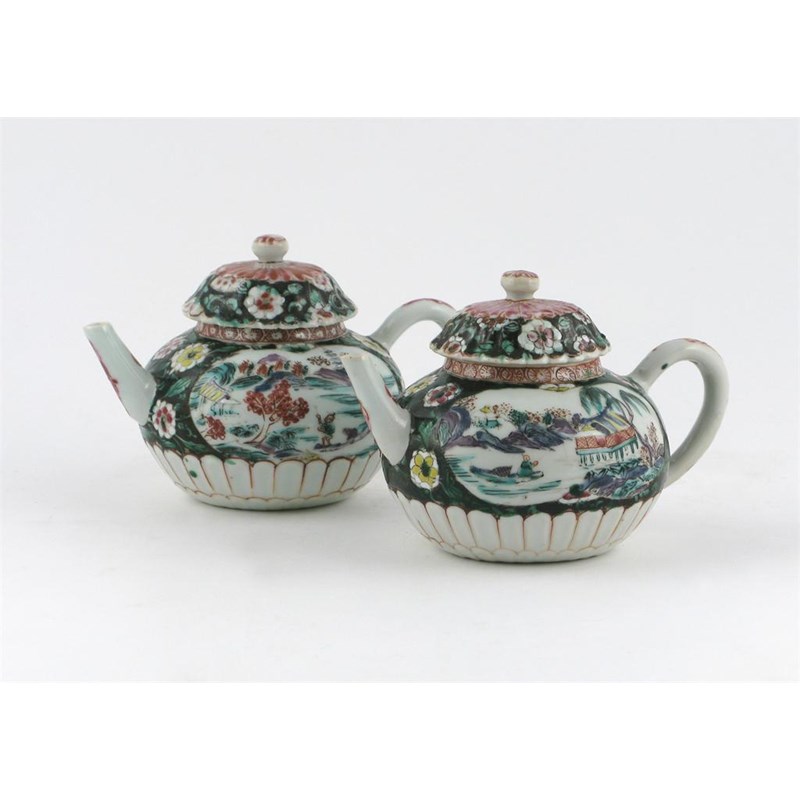 A rare pair of Chinese famille rose chrysanthemum moulded teapots, each painted with colourful panels containing figures in boats in watery landscapes on a wide green and black enamel floral bands, early Qianlong c.1740, 14.5cm. (4)