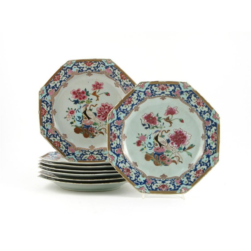 Set of eight Chinese famille rose octagonal plates, painted with pheasants standing beside turquoise vases amidst pink peony blooms, 18th century, small rim frits three with faint hairline cracks, 21.5cm. (8)