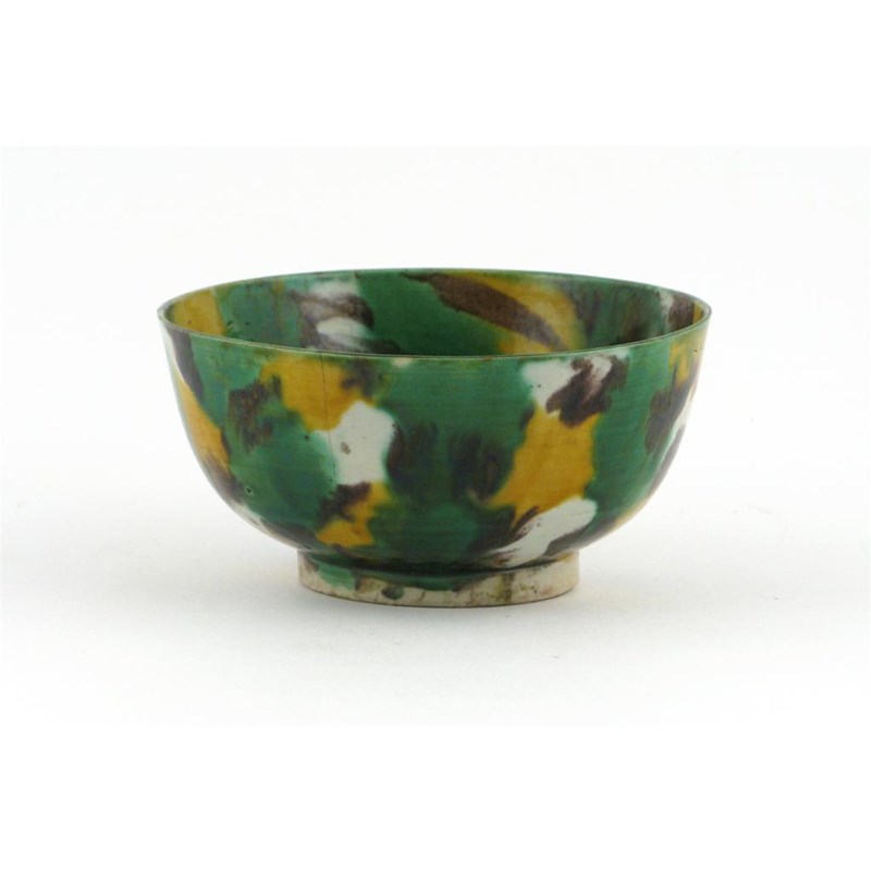 A Chinese brinjal bowl, decorated with green, yellow and aubergine splashes, the base with a four character Chenghua mark, but Kangxi 1662-1722, rim cracks and wear, 12.3cm.
