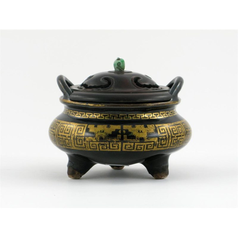 A Chinese porcelain censer, with a pierced wood cover, the body glazed black and decorated in gilt with a key fret band, the base with a six character gilt Qianlong mark, 18th / 19th century, glaze chips around the feet, a little gilt wear, 14cm. (2)