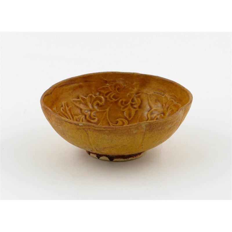 A Chinese chi-chou type amber glazed stoneware bowl, moulded in relief with leaves and flower sprays, probably 14th century, 10cm.