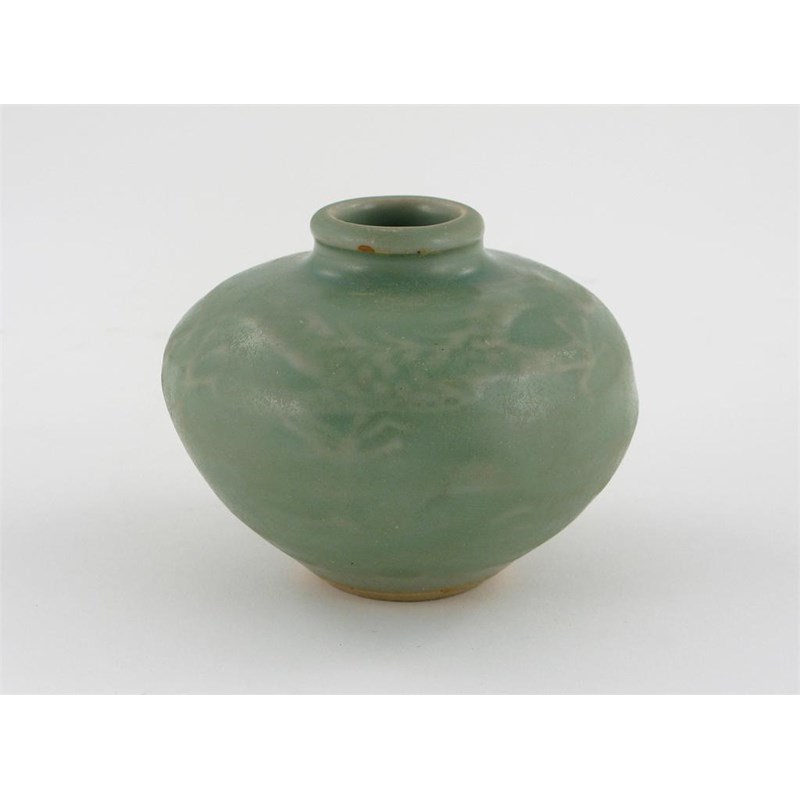 A small Chinese celadon ovoid vase, the shoulder moulded with a scaly dragon in pursuit of a flaming pearl, 9cm.