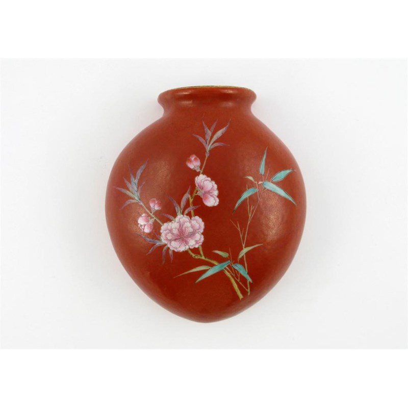 A Chinese famille rose coral ground wall vase, the ovoid body painted with bamboo and pink blossom, unmarked, probably 19th century, 12.6cm.