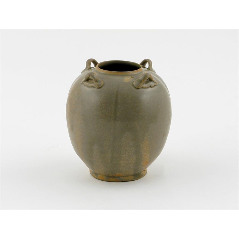 A Chinese celadon glazed quatre-lobed ovoid jar, with four small handles to the shoulder, probably Five Dynasties, 9.8cm.
