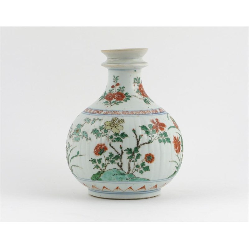 A Chinese famille verte ribbed ovoid vase, painted with a band of lotus, peony, prunus and chrysanthemum, the base with a flower mark, Kangxi 1662-1722, the neck reduced, 17.5cm.